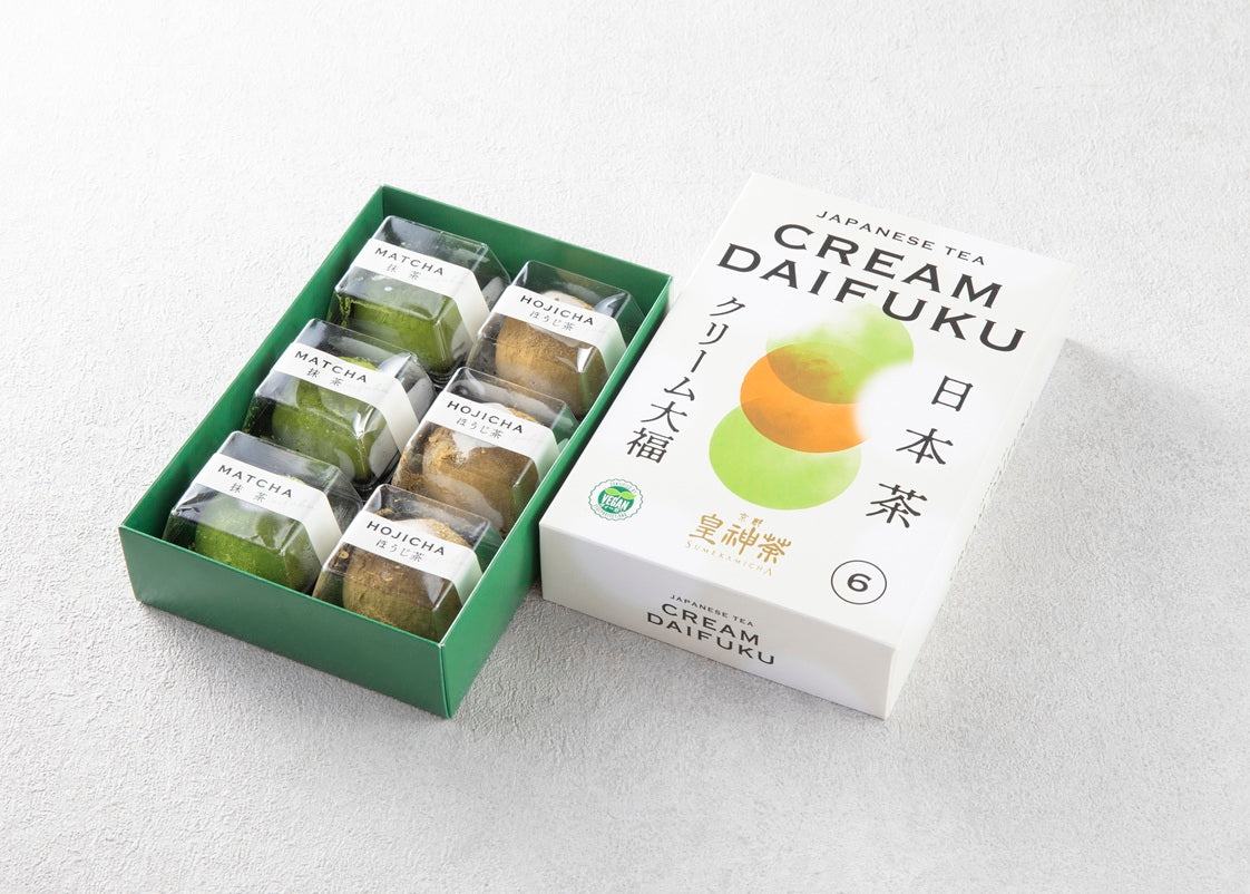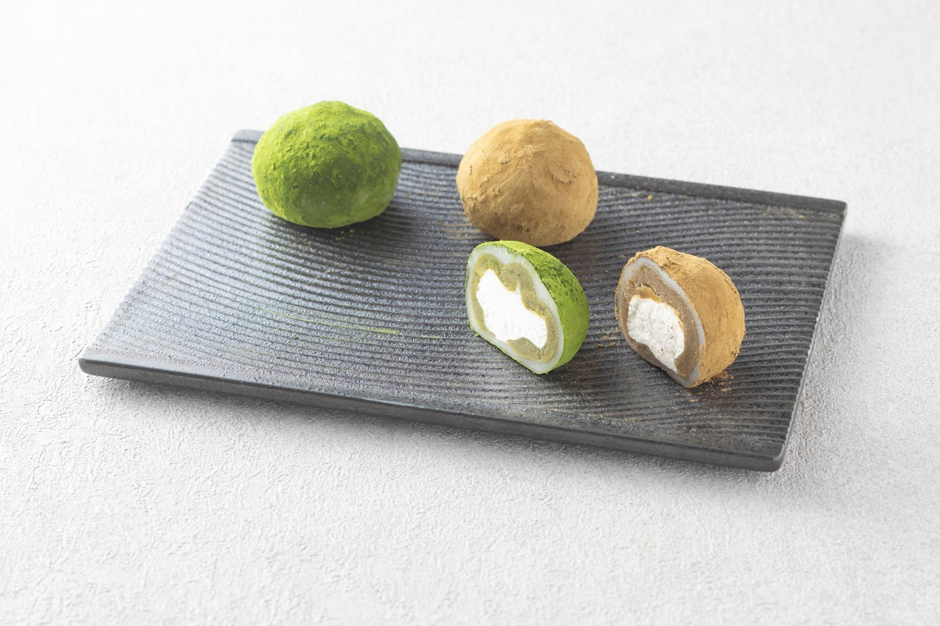 Hojicha flavour <br>The daifuku dough is made from glutinous rice flour and beet sugar, and is stuffed with hojicha bean paste made from white bean paste, beet sugar and hojicha powder, as well as cream made from soy milk.